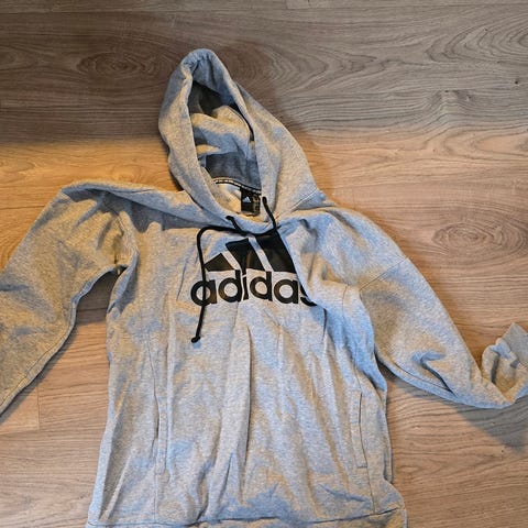 Adidas hettegenser for herre i størrelse M. Genseren er grå og laget i bomullsmateriale. Den har hette, lang erm og kengurulomme foran. Adidas-logo er plassert på brystet. Passer til hverdagsbruk og trening i kjøligere vær.