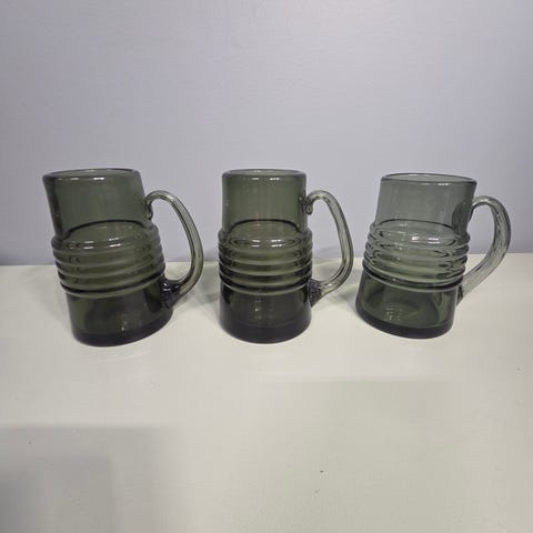 Hadeland Glassverk Vintage glasskrus Retro glass 70-talls design Norsk design Grønt glass Røykglass Pressglass Retro kjøkken Vintage kjøkken Mid century Skandinavisk design 70-tallet interiør Retro kopp Glasskrus Samlerglass Hytte interiør Vintage bar Ølkrus glass Norsk retro