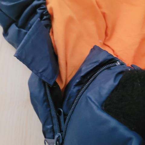 Blå anorakkjakke med hette. Jakken har glidelås i halsåpningen og stramming nederst. Lett stoff som egner seg som vind- eller regnjakke ytterst.