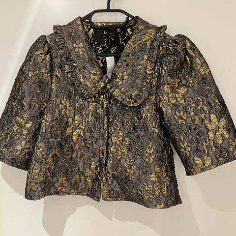 Floyd Jakke for dame i størrelse M. Blusen er beige og laget i viskose. Den har korte, voluminøse ermer og rund hals med 1 gull knapp øverst foran, og 2 trykk knapper. Stoffet har en lett skinnende, strukturert overflate. Passer til bruk ved ulike anledninger, både til bukse og skjørt/kjole.Brukt kun få timer.!