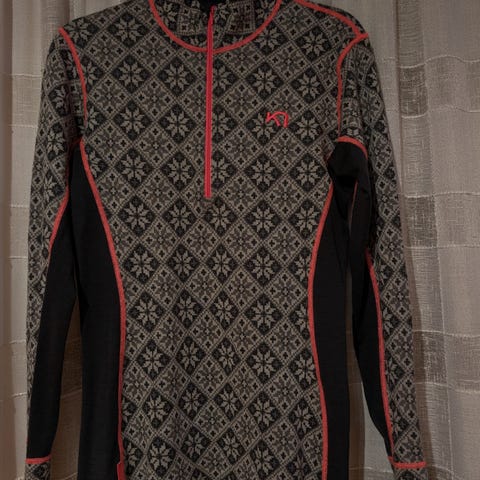 Ullundertøysett for dame i størrelse XL. Sett med langermet genser og longs. Begge deler har blå bunnfarge med lyst, geometrisk mønster og kontrastsømmer i rosa. Genseren har høy hals med glidelås. Passer som innerste lag til ulike utendørsaktiviteter eller som varmende plagg til hverdagsbruk.