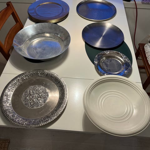 Hvitt serveringsfat sett. Består av ett større fat i midten og to mindre, buede fat som kan brukes sammen som et komplett serveringsfat eller hver for seg.