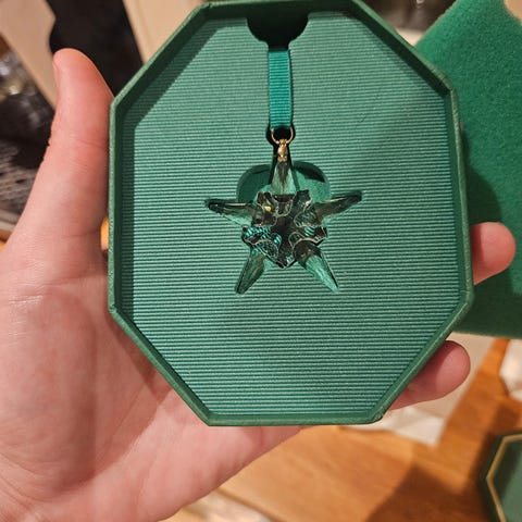 Elegante grønne swarovskikrystaller. Kan brukes som dekor i lamper, lysestaker eller på andre kreative måter. Selges samlet eller hver for seg. En er brukket og synlig satt sammen igjen. Kr 200,- per stk.