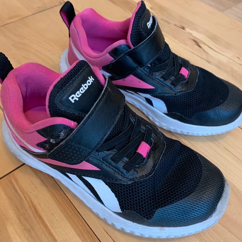 Reebok joggesko for jente i størrelse 30. Skoene har svart overdel med rosa og hvite detaljer samt hvit yttersåle. Modellen har kombinert snøring og borrelås over vristen for enkel tilpasning og av- og påkledning. Overdelen er i tekstil og syntetisk materiale med pustende meshpartier. Polstret hælkappe og krage gir ekstra komfort. Yttersålen er i mønstret gummi for bedre grep. Egnet som hverdagssko og til lett aktivitet for barn. Brukt som innesko.