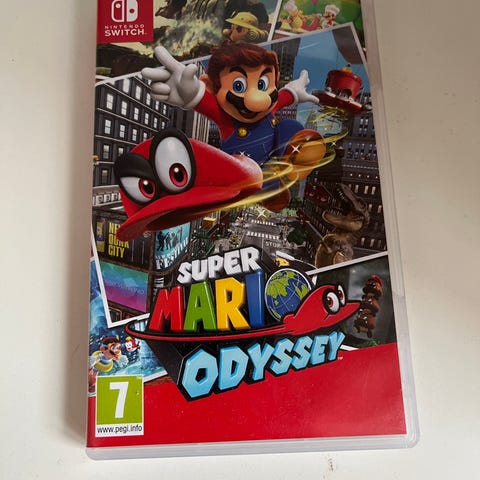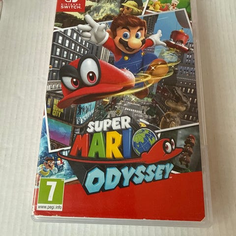 Nintendo Switch Super Mario Odyssey spill. Action- og plattformspill der spilleren styrer Mario gjennom ulike verdener for å samle måner og komme videre i historien. Spillet er laget for Nintendo Switch-konsoll og støtter én eller flere spillere avhengig av spillmodus. Aldersgrense 7 år ifølge PEGI-merking på omslaget.