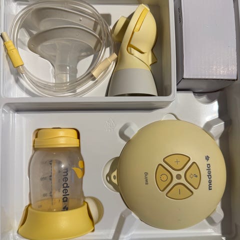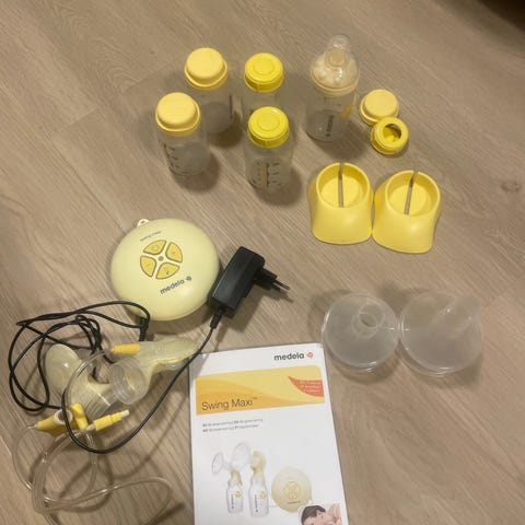 Medela Swing Flex elektrisk brystpumpe med flasker og tilbehør.