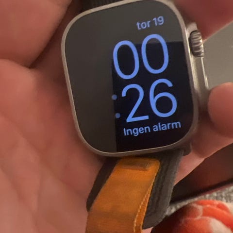 Apple Watch Ultra smartklokke. Klokken har rektangulært urkasse-design med digital krone og sideknapp. På bildene følger det med flere utskiftbare reimer i ulike farger og materialer. Smartklokken har optiske sensorer på undersiden for måling av aktivitet og helsefunksjoner, samt berøringsskjerm på forsiden. Leveres med eskeinnmat som vist på bildene.
