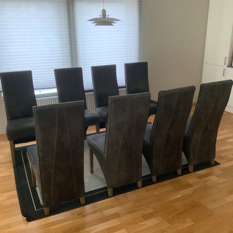 Brukt spise gruppe med 8 stoler og 2 ekstra plater til hver ende. Bordet har noen skrammer. Endene kan tas bort med å bare dra dem ut. Prisen kan diskuteres ved hurtig salg. Har det dessverre ikke plass i nye leiligheten .