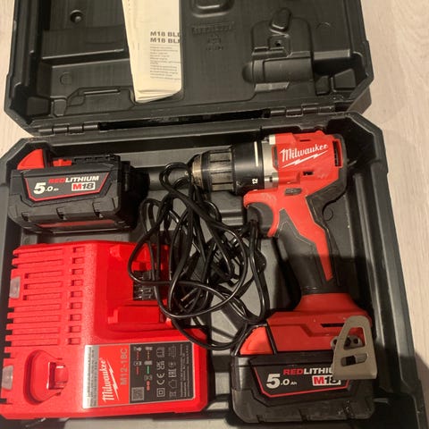 Milwaukee drill med 2 batterier og lader selges.