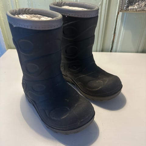 Bisgaard gummistøvler til barn, unisex, i størrelse 23. Støvlene er grå og har fôr på innsiden for ekstra varme. Øverst har de snøring med stopper for å kunne stramme rundt leggen. Sålen er mønstret for bedre grep. Egnet til bruk i vått vær og overgangssesonger.