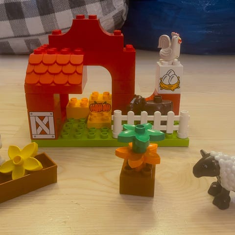 LEGO Duplo 5657 Toy Story sheriff-sett. Inneholder sheriff-portal med dør, Jessie-minifigur, hest (Bullseye), bord med grønne klosser, kasse med klosser og noen ekstra Duplo-klosser. Passer til rollelek med western- og Toy Story-tema for små barn som bruker Duplo-klosser.