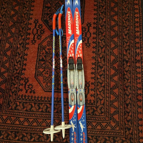 Langrennski barn. Begge par er 130cm lamge. 150 pr par. 110cm staver kan medfølge gratis. Fungerer men mangler en spiss