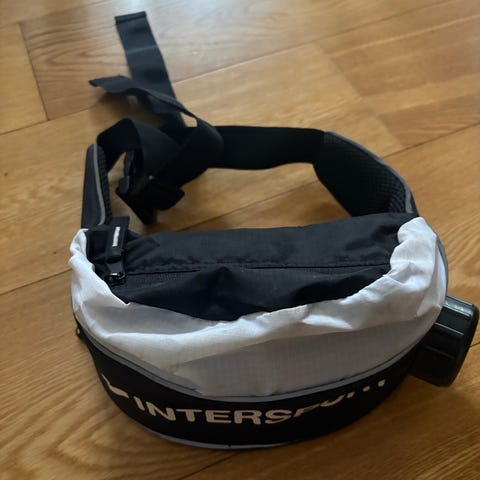 Helt ubrukt Heldre magebelte med innebygd drikkeflaske. Lomme på topp og liten lomme på siden. Justerbart belte med borrelås og enkel låsemekanisme. Bredt belte, behagelig å ha på.