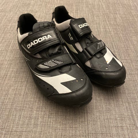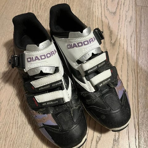 Diadora sykkelsko i størrelse 37. Skoene er hvite med lilla detaljer og har borrelåslukking over vristen for enkel justering. Overdelen er i syntetisk materiale med perforerte felt for ventilasjon. Sålen er stiv for effektiv kraftoverføring ved sykling. Egnet som sykkelsko til trening og turbruk.