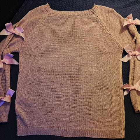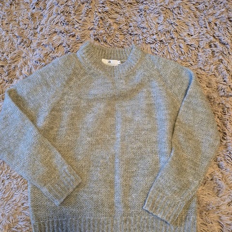 Genser for dame i one size. Genseren er grønn og strikket i akryl. Den har rund hals, ribbestrikket struktur og lange ermer. Passformen fremstår som romslig, og lengden går omtrent til hofteområdet.