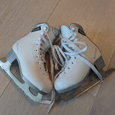 Cycar kunstløpskøyter for barn i størrelse 27. Klassisk hvit modell med snøring og høy ankelstøtte. Leveres med løse innersåler som vist på bildene. Egnet som barneskøyter til lek og enkel kunstløpstrening på isbaner og skøytebaner.