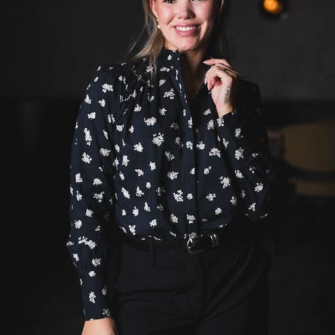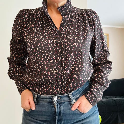 Selger bluse fra Pia Tjelta -Molly bluse laget i en behagelig bomull og viscose blanding med engelsk broderi over hele blusen. Den har en rett fasong med fine detaljer som mansjetter i ermene, rynker på skuldre og krage og en knappelukkning foran.
