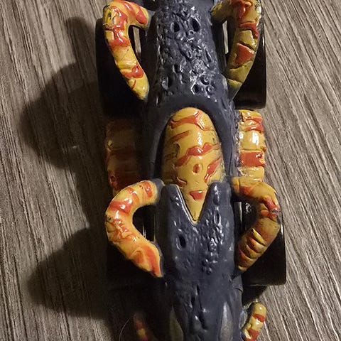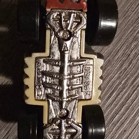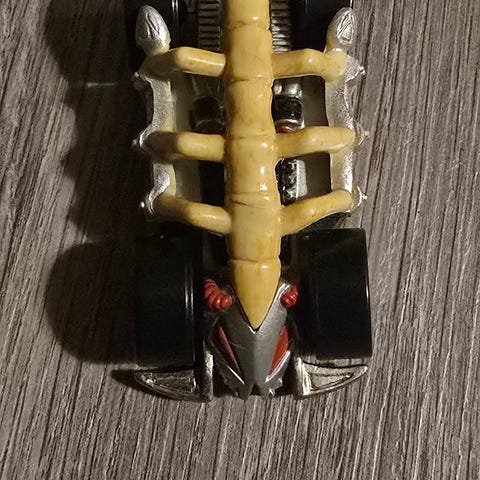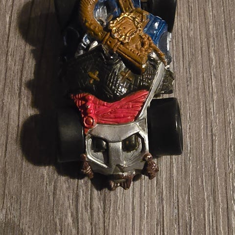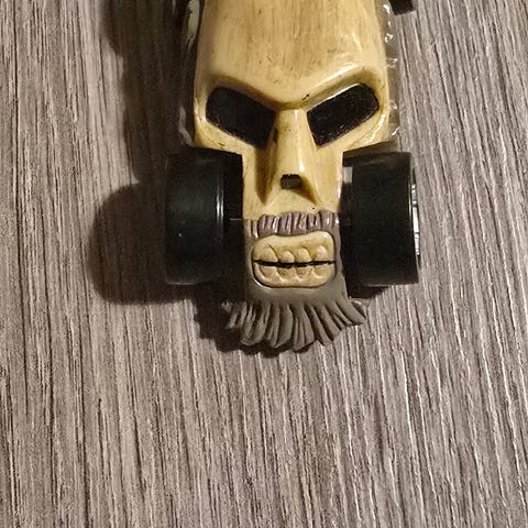 Design: Bilen har et tydelig pirat- og skjelettema med en synlig ryggrad langs midten og en hodeskalle-lignende front med røde detaljer.