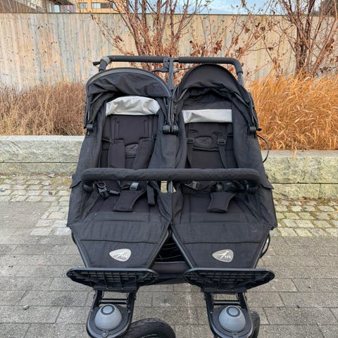 Praktisk vogn med to seter side om side. Vognen er i mørk/sort farge og har justerbare seler i begge seter. Solid konstruksjon med store hjul som gjør den enkel å trille, også på ujevnt underlag.
