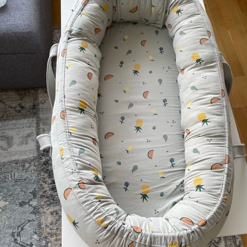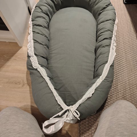 Babynest i beige farge. Myk og polstret kant rundt hele, med knyting nederst for justering av åpning. Ytterstoff i tekstil med vaffelstruktur.