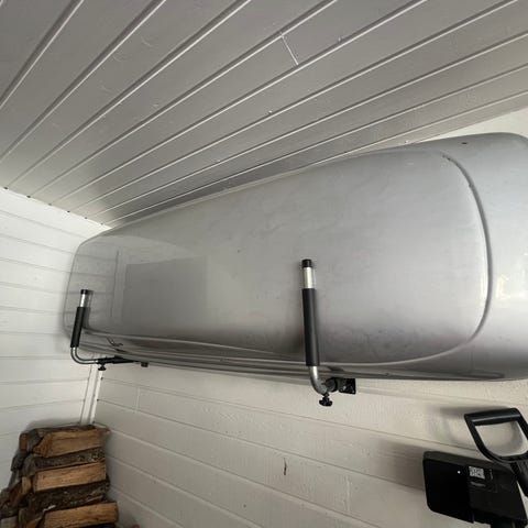 Sølvfarget glassfiberboks med Thule firkantede skistativ. Nå står det føtter til "rails" står på skistativet, men vi har noen alternative føtter liggende.