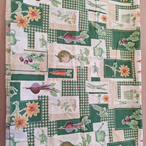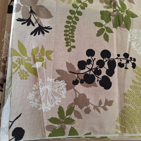 Fortsatt I orginalemballasjen. Fin og lekker korallfarge. Blir fine kjøkkengardiner, duk, trekk til pyntepute, gardinkappe, spisebrikker m.m.