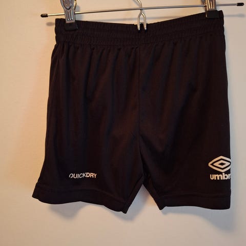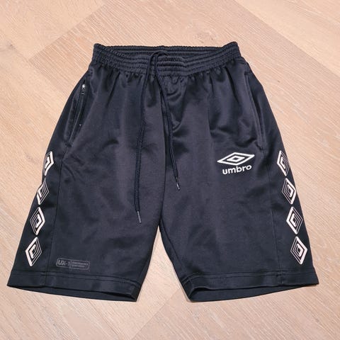 Umbro treningsshorts i svart farge, størrelse M. Shortsen har elastisk linning med snøring for justerbar passform. Laget i et lett og glatt materiale som egner seg til trening, fotball og annen fysisk aktivitet. Umbro-logo på siden av benet. Glidelås i lommene
