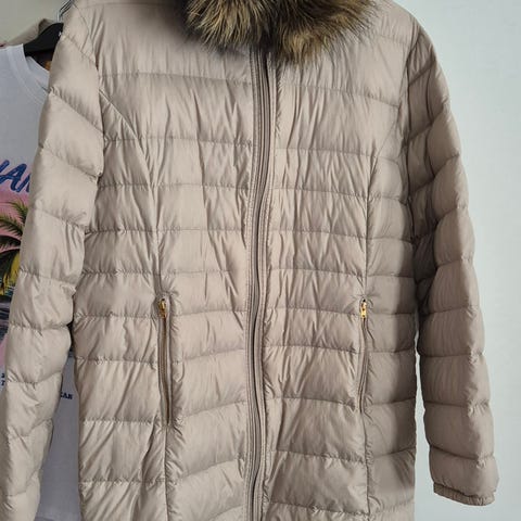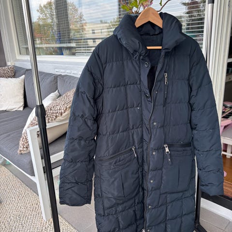 Tretorn svart dunkåpe i str XL. Romslig og holder bra på varmen i denne. Rekker meg til knærne og jeg er 178cm høy. Ser litt blass ut i lyset, men den er fin og svart!