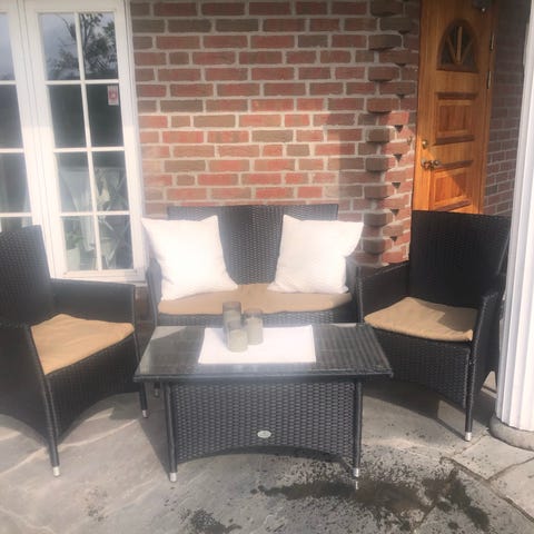 Hagemøbelsett bestående av en svart benk med sittepute og et svart bord med glassplate. Settet passer til utendørs bruk og har en moderne design med en kombinasjon av metall, glass og tekstilmaterialer.