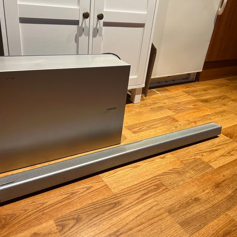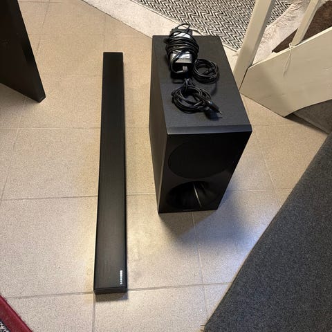 Samsung HW-H551 lydplanke med tilhørende subwoofer i sølvfarge. Systemet består av en avlang lydplanke og en separat subwoofer-enhet. Fjernkontroll følger med, som vist på bildene. Egnet for bruk sammen med TV eller andre lydkilder via tilgjengelige tilkoblinger på enhetene. Passer for plassering foran TV eller på TV-benk, med subwoofer plassert på gulv i nærheten for bedre bassgjengivelse.