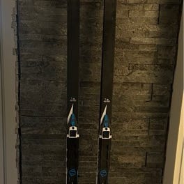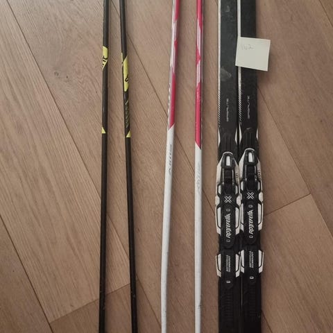 Selger smørefrie langrennski, Salamon, til barn i lengden 130 cm og staver, Fisher, i lengden 100 cm. Pris 300 kr.