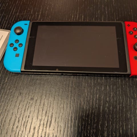 Nintendo Switch spillkonsoll med blå og rød Joy-Con-kontroller selges. Konsollen har innebygd skjerm og kan brukes både håndholdt og på TV med medfølgende adapter.