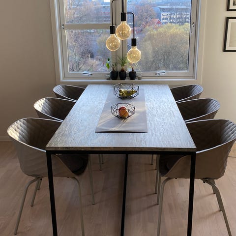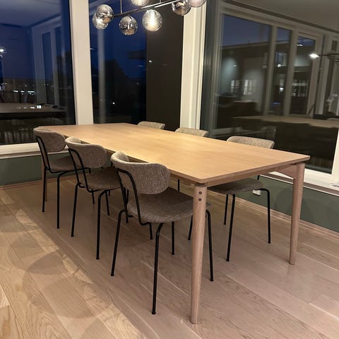 Spisebord med 4cm heltre eikeplate på Hay loop stand understell. Mål:90x215cm