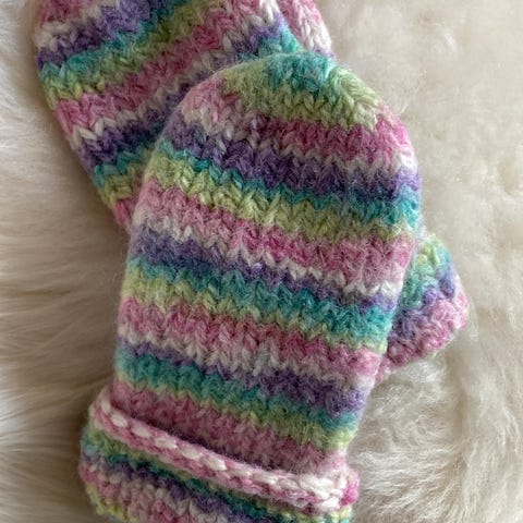 Vossatassar lue og hjemmestrikket votter som selges samlet. Passer til et barn fra 3-7 år.