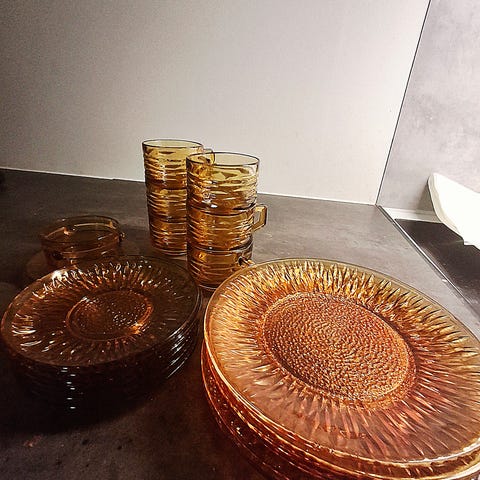 Frokost-servise for 6 personer. Asjett, kaffe/te krus, m skål og eggeglass. Duralex France 20. Ravfarget.