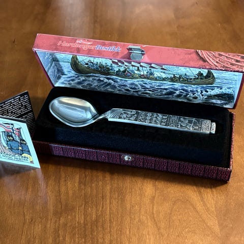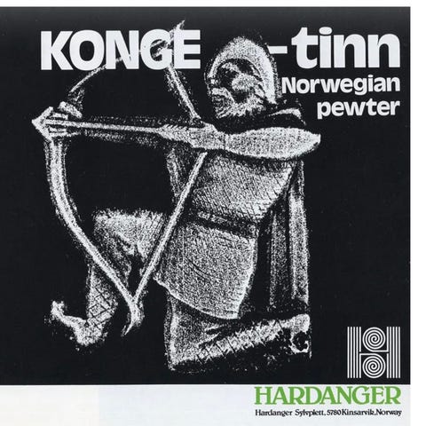 Kongetinn bestikk. 4 gaffel, 4 kniv, 6 skje samt 1 øl/brusåpner. Kr. 100 pr stk. Har også Geilo tinn fruktkniver 8 stk. 6 av disse i orginal etui. Kr 300. Kongetinnet samlet kr 1500.