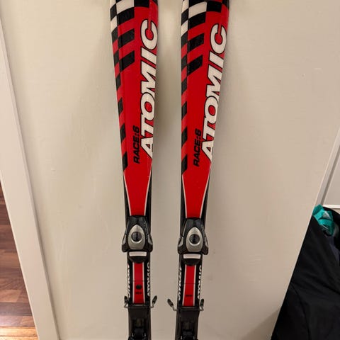 Atomic Race 8 alpinski med integrerte bindinger. Bindingene er montert på skinnen og kan normalt justeres noe etter støvellengde. Egner seg for løpere som ønsker et par carvingski til bruk i alpinanlegg.