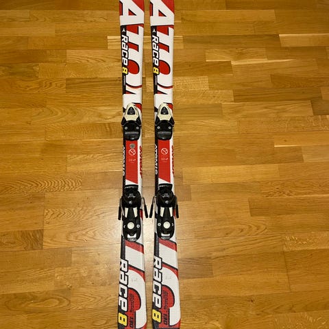 Völkl Racetiger alpinski i lengde 140 cm. Skiene har oransje og svarte detaljer i designet. Undersiden er jevn med tradisjonell stålkant. Leveres med monterte bindinger, som vist på bildene. Passer til alpint på preparerte løyper.