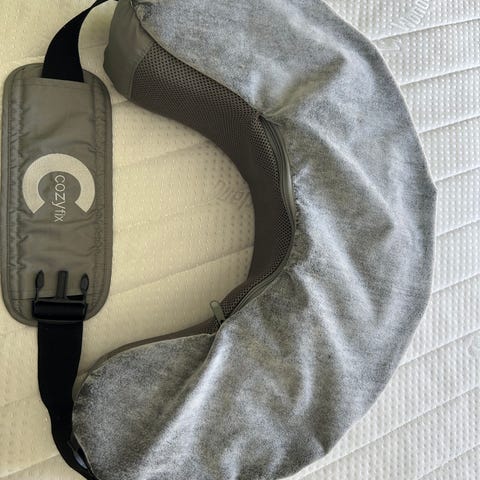 Cozyfix pute for mageleie i beige tekstil med svart innside og feste/rem. Puten er formet som en halvmåne og er utviklet for å gi støtte ved mageleie, for eksempel til barn som trenger stabilisering i liggende stilling. Yttertrekket er i mykt stoff, og remmen gjør det mulig å feste og justere puten etter behov. Egnet til bruk i seng eller på matte der det er behov for ekstra støtte i mageleie.