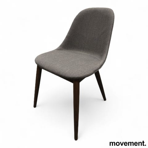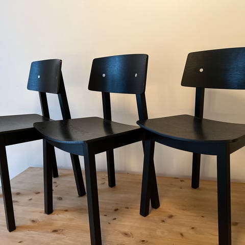 Audo Copenhagen stol av Norm Architects. Sete, rygg og armlener i tre med mørk finish, understell i metall med slanke ben.