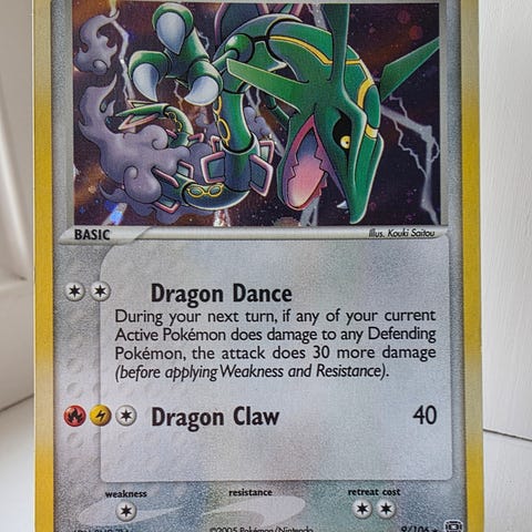 Pokémon Rayquaza Holo #9/106 Emerald. Kortet er played og ganske slitt. Sender gjerne flere bilder ved interesse.