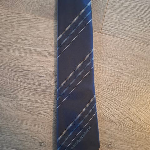 Theo Lammers BP herreslips i mørkeblå ren silke med skrå grønne striper. Slipsen har vevde skjoldmotiv i stoffet og klassisk fasong. Passer til formelle og semi-formelle anledninger, for eksempel til dress eller pen skjorte.
