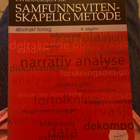 Abstrakt forlag Samfunnsvitenskapelig metode lærebok i samfunnsfag. Boken tar for seg samfunnsvitenskapelig forskningsmetode, med temaer som forskningsdesign, narrativ analyse, diskursanalyse, datainnsamling og tolkning av data. Egner seg som pensumlitteratur og referanseverk i samfunnsfaglige studier og forskning.
