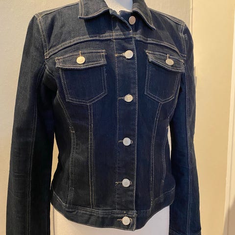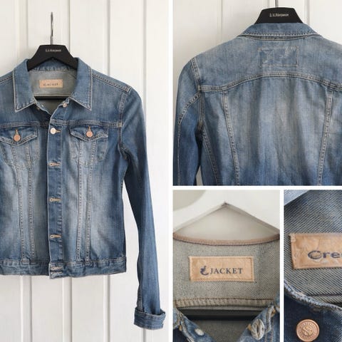 denimjakke for dame i størrelse 40. Jakken er i blå denim med lys vask og har skrå glidelås i front. Den har krage med slag, glidelåslommer i sidene og beltedetalj nederst. Materialet er denim (mog passformen er kort og figurnær. Egnet som ytterjakke i overgangssesonger eller som et lag over andre plagg.