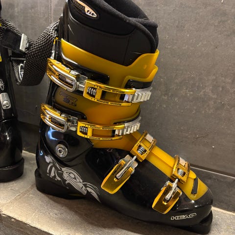Head Monster alpinski med bindinger i rød og svart design. Skiene har integrerte bindinger som er montert på skiens midtsone. Undersiden er sort med tradisjonell såle. På siden av skiene er det preget inn tallkoder som angir modell- og produksjonsdata. Egnet som alpinski til bruk i bakke.