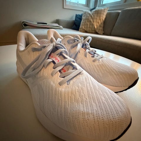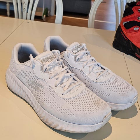 Skechers Slip-ins joggesko i hvit farge i størrelse 38. Modellen har elastisk hælparti som gjør at skoene kan tas på uten å bruke hender. Overdelen er i lett syntetisk materiale med snøring foran og polstret kant rundt ankelen. Innleggssålen er merket Skechers Slip-ins og er utformet for komfort ved hverdagsbruk og lett aktivitet.ny pris 1600