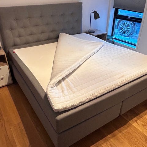 Sengen er renset og godt vedlikeholdt. Overmadrassen har noen flekker – jeg har forsøkt å rense og vaske den, men den er ikke helt som ny. Den kan følge med hvis ønskelig.