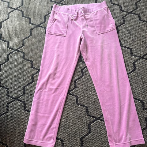 Juicy Couture joggebukse for dame i størrelse L. Buksen er rød og laget i polyester. Den har rette ben, strikk og snøring i livet samt sidelommer. Egner seg som hverdags- og fritidsbukse.