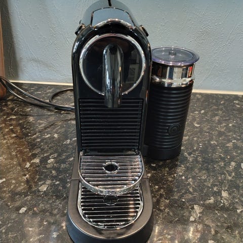 Nespresso kapselmaskin med melkeskummer i svart. Maskinen er beregnet for bruk med Nespresso-kapsler og har dryppbrett og avtagbart ristenett for kopp. Medfølgende melkeskummer kan brukes til å varme og skumme melk til kaffe- og espressedrikker. Egner seg til bruk på kjøkkenbenk i hjem eller kontor.