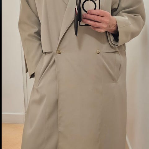 Kåpen er beige. Den har krage, knappelukking foran og knapper på mansjettene. Sidelommer gir plass til småting eller til å varme hendene. Veldig lett og god. Mer vår/sommer.